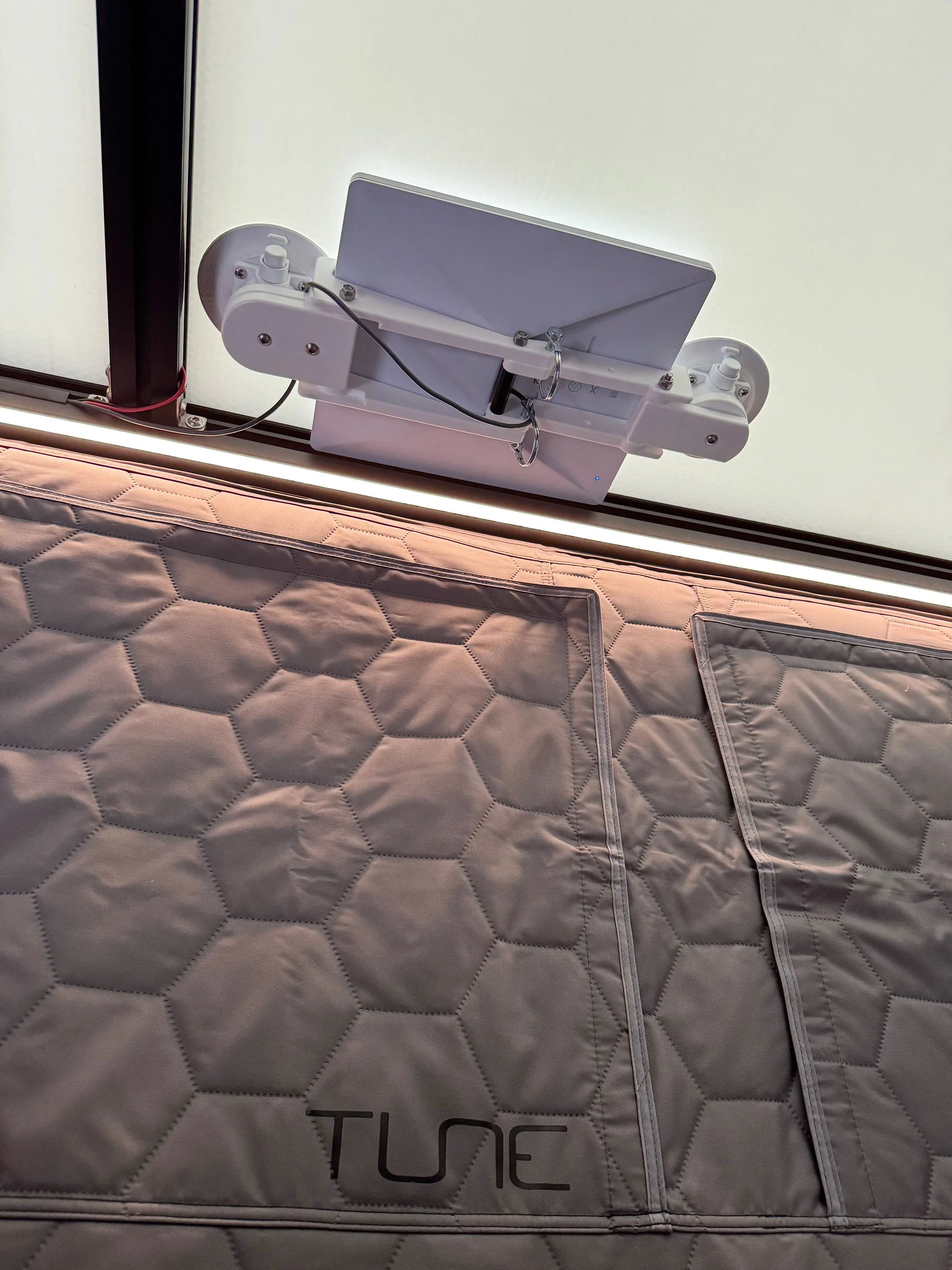 The Tune M1 has a white plastic roof, which is ideal for internally mounting my Starlink Mini. I use a Seasucker Starlink Mini mount, which suctions to the underside of the roof. Unlike regular suction cups where you never quite know how well they’re attached, Seasuckers have vacuum pumps that reveal a bit of orange if they’re losing strength. A few quick pumps will increase the grip strength. I positioned the mount so that the pumps are easily seen and accessed.
