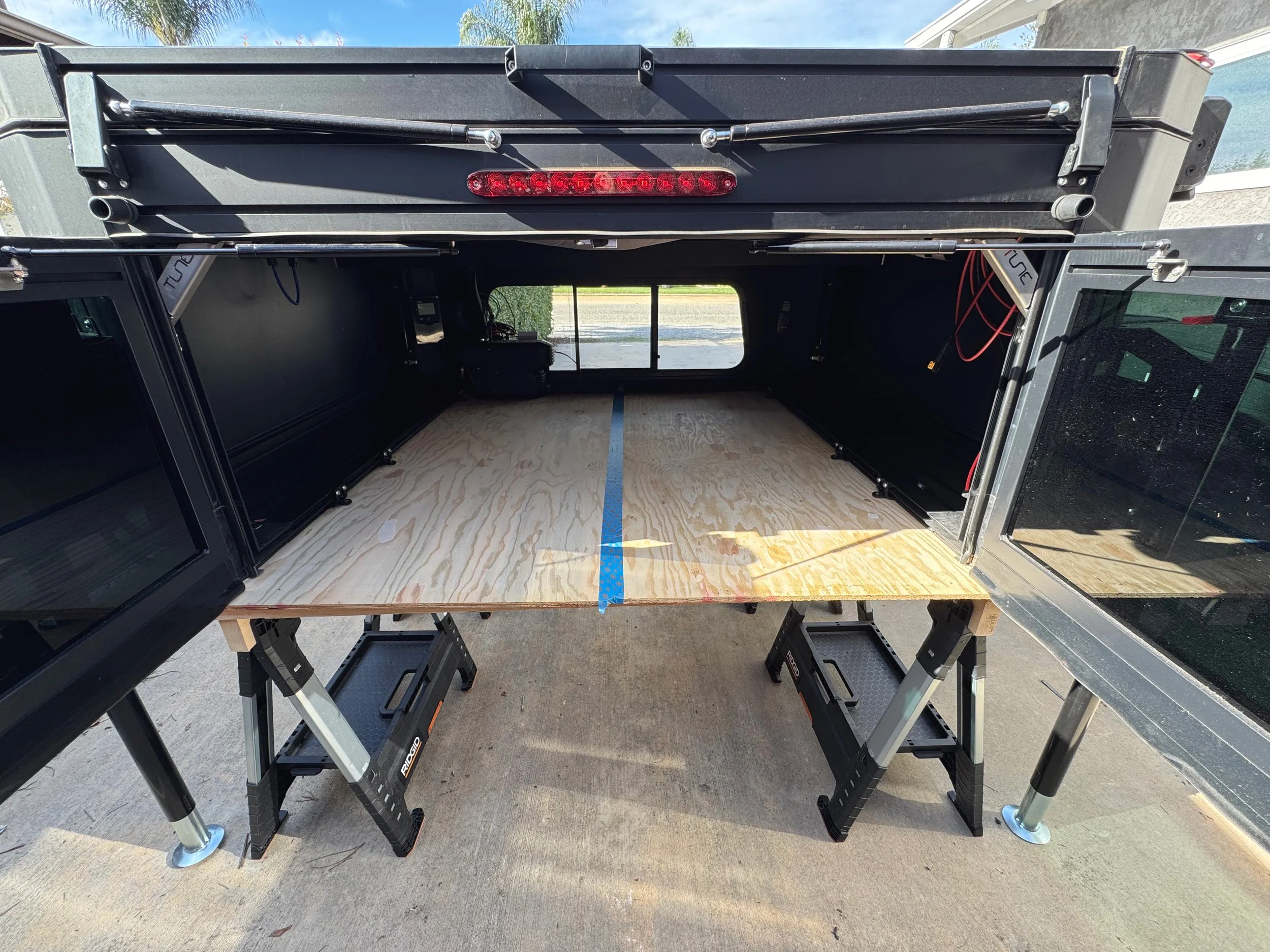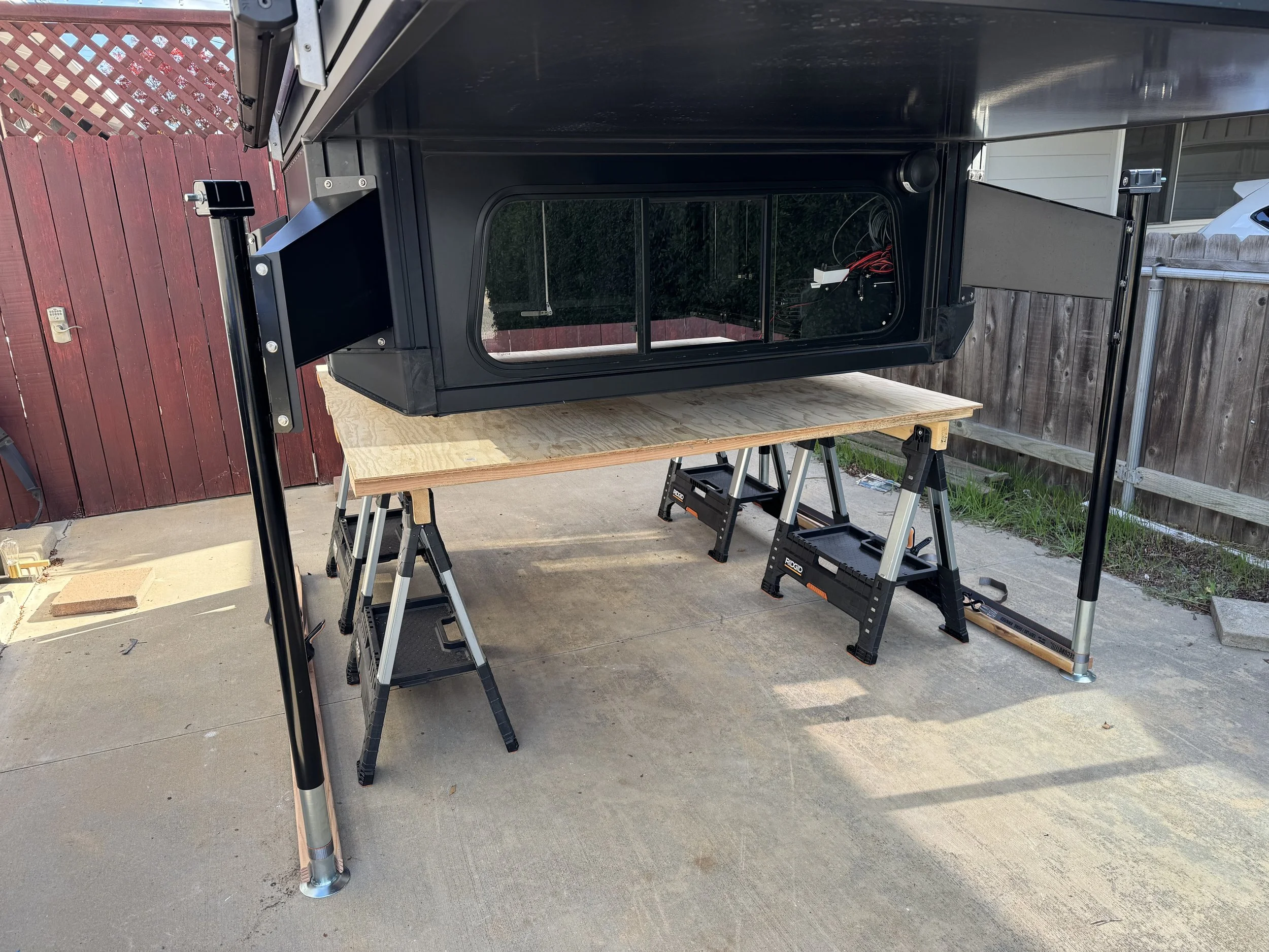 After removing the interior, I attach the camper jacks, ensure they’re making contact with the ground, then loosen and remove the 6 bolts that clamp to the camper to the truck bed. After jacking it up a few inches to fully clear the truck bed, I can drive out from under it, then slowly lower it onto a platform made of 4x Ridgid sawhorses (rated for 2400lbs each), 4x 2x6, and two pieces of half inch plywood. I then remove the jacks and cover it with a RV cover to protect against UV light. The cover is quite large, but using some spring clamps and a ratchet strap, it’s a reasonable fit.