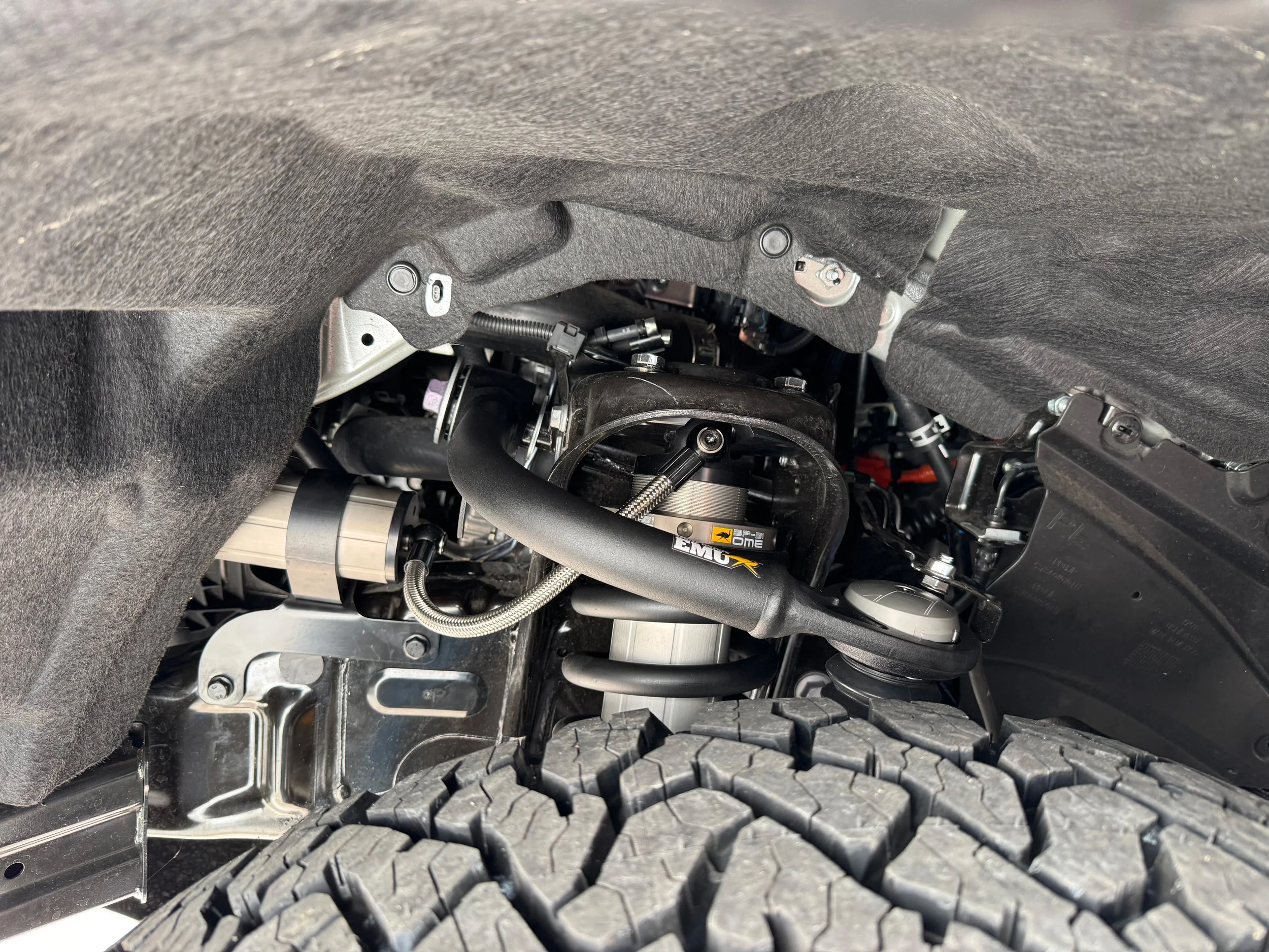 Front suspension components with OME BP51 and UCA. I like how the ball joint of the UCA is sealed from dirt, water and road grime. The height of the front shocks are adjustable, and were set for 2” of lift.