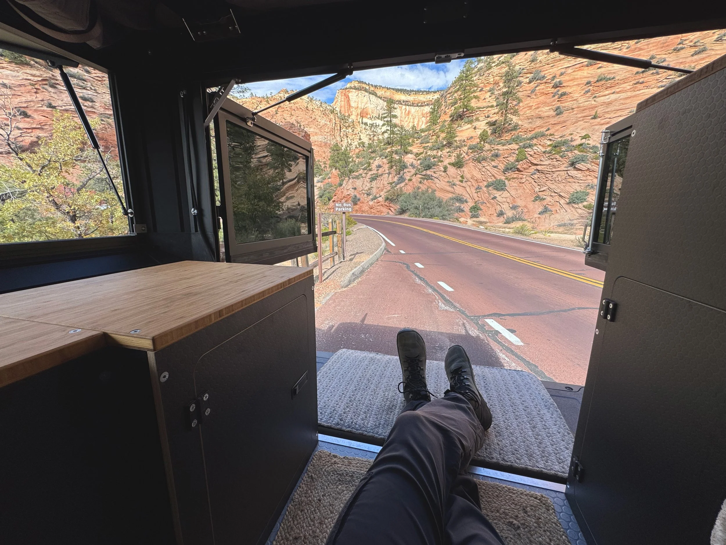 The rug in this photo is a 2’x3’ jute doormat from Amazon. Although there isn’t a lot of floor space, the inside feels absolutely cavernous thanks to the wide walls of the Tune M1, the high ceiling, and the efficient use of space with the Vecel interior.
