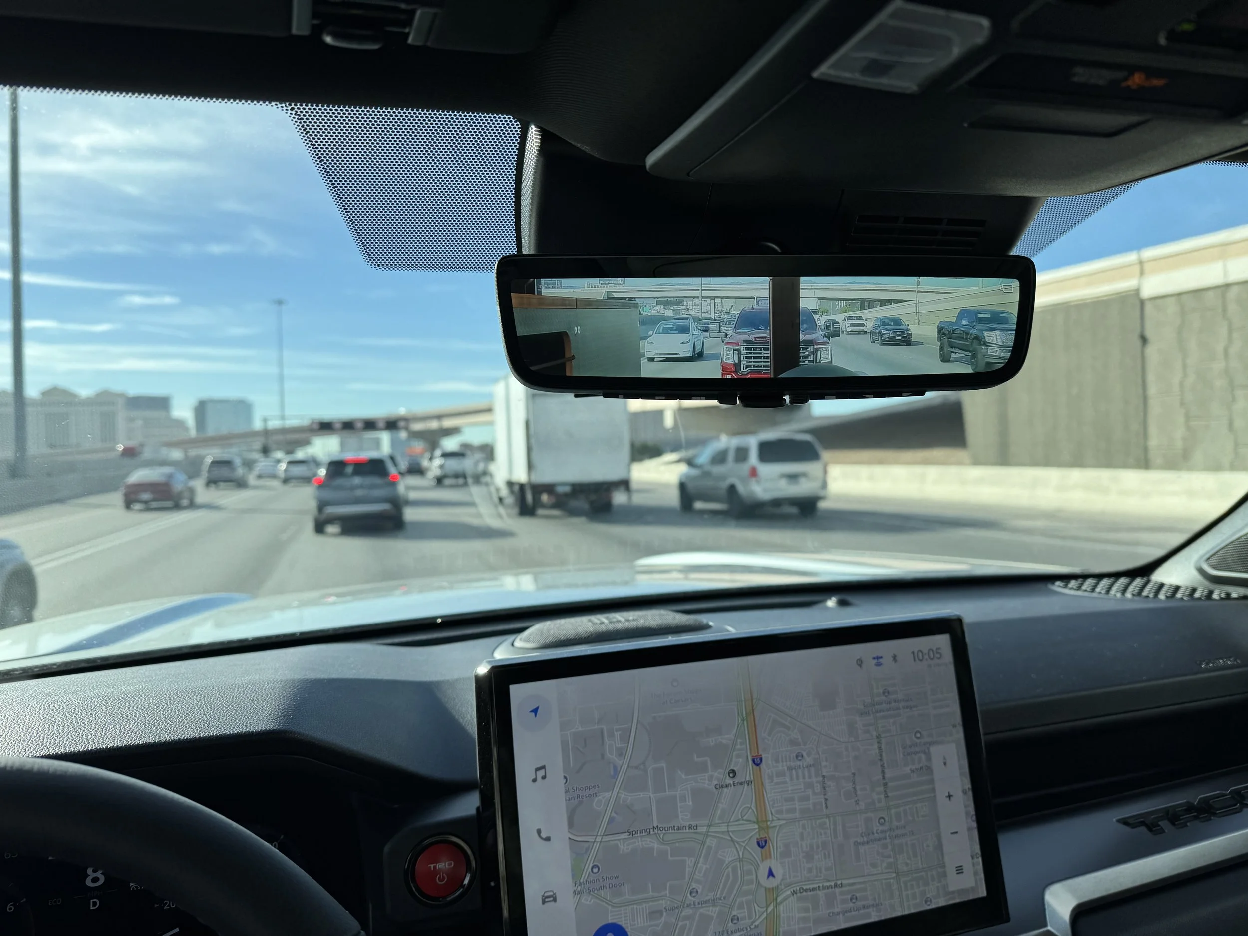My view in traffic while driving with the Tune M1. The line down the middle is the rear barn doors, and the dark object on the left is part of my Vecel interior (more on that later), neither of which block anything important while driving.