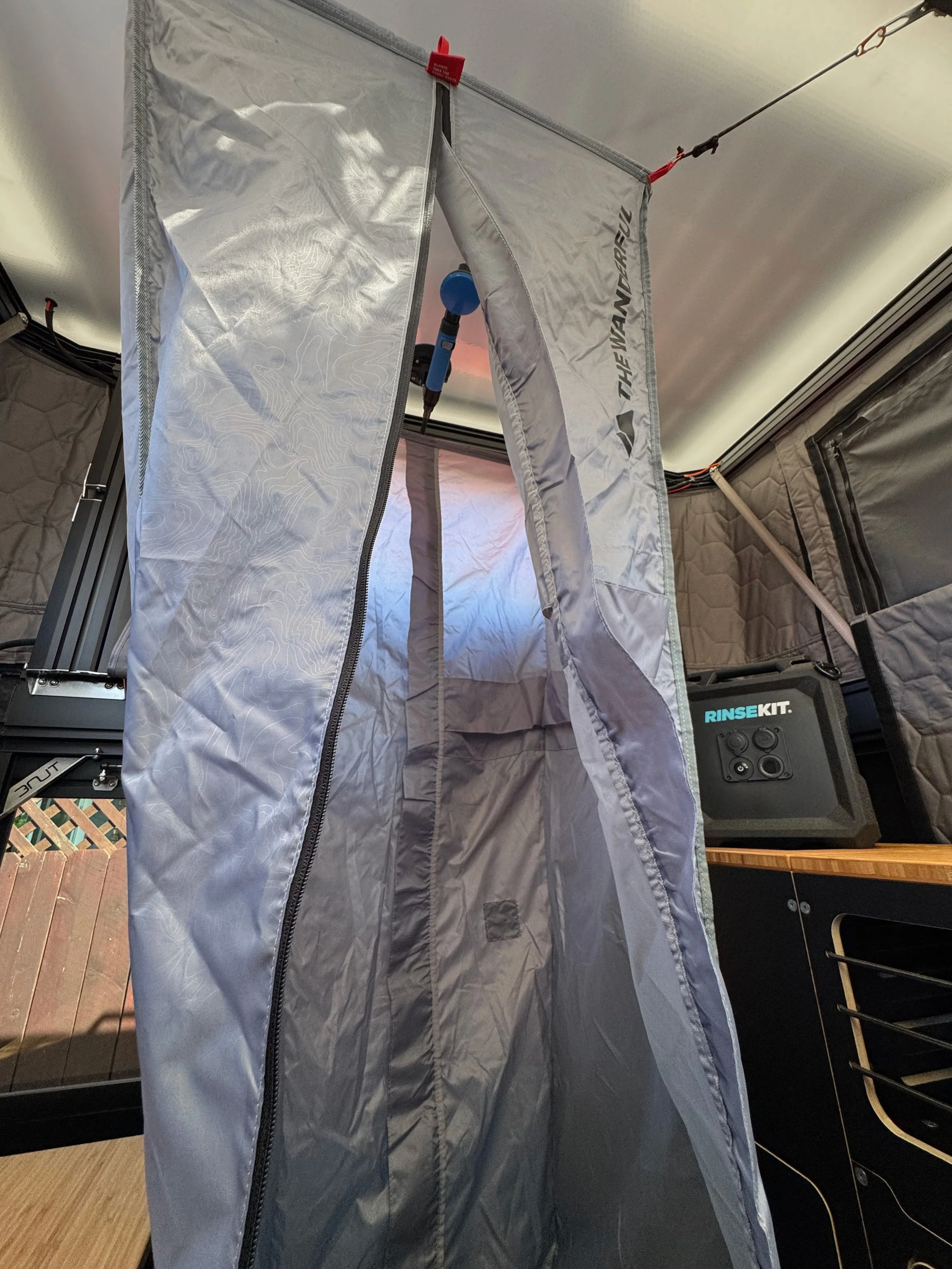 This one takes a bit more creativity, but I’ve found a system that works well. For the enclosure, I use the lightweight shower system made by The Wanderful. It’s comprised of a lightweight rectangular shower curtain with stiffeners along the top and bottom edges to hold its shape, and a foldable basin to capture the water. There’s no drain, but it only takes a couple gallons of water to shower, and the basin can be siphoned when you’re done. I attach the shower curtain via the Tune gear anchors that were included in the accessory pack. The enclosure is certainly small, but it gets the job done and realistically it can’t be all that much larger.