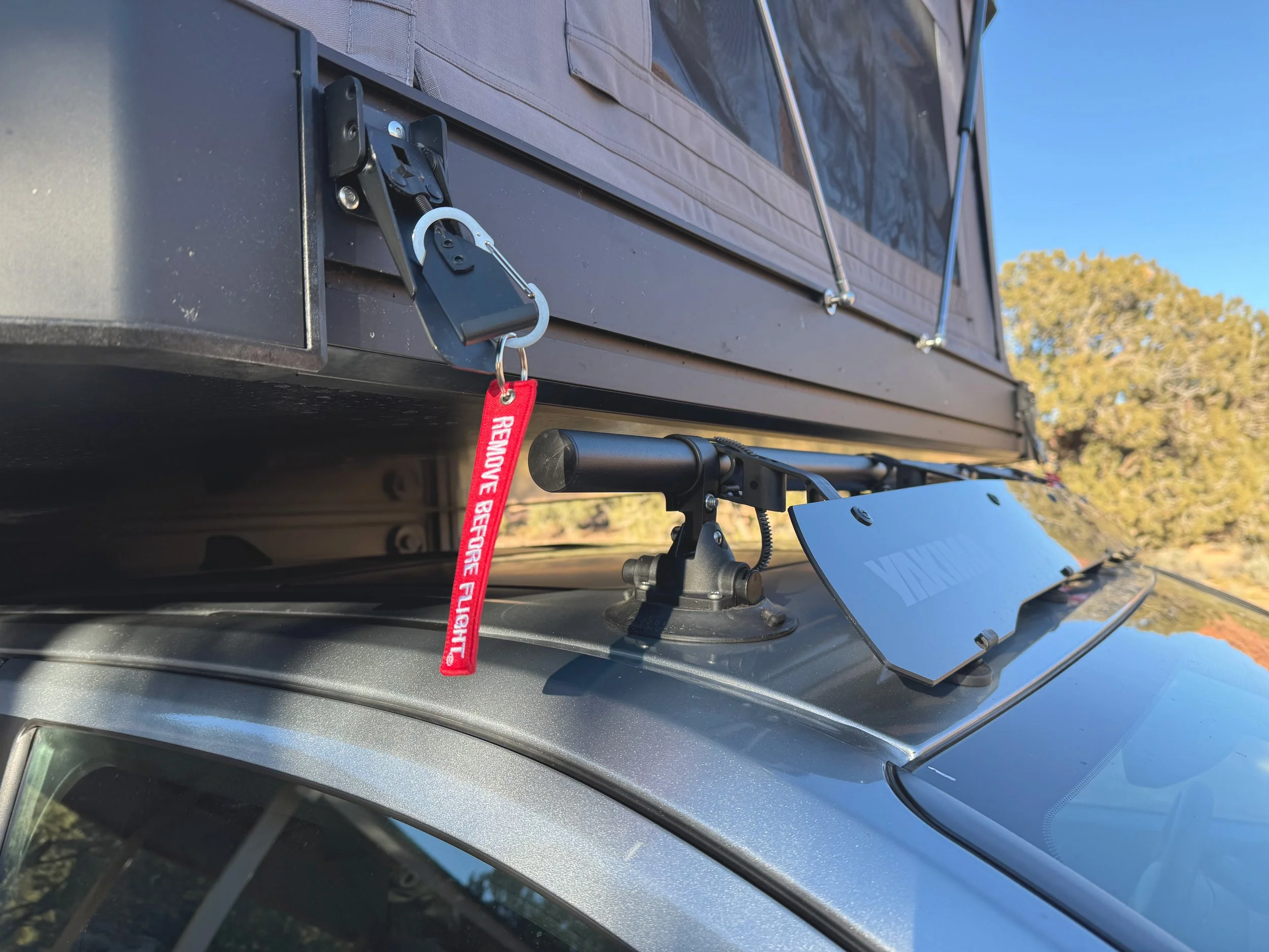 After lowering the roof on the Tune M1, 4 latches must be secured before driving. If one were to be distracted by anything during this process (Squirrel!), it’s easy enough to simply drive off with these latches unsecured. To guard against this, I purchased some bright red “Remove Before Flight” keychains on Amazon, and attached them to S Biner clips. I attach one to each latch while setting up the camper. They are extremely visible, and even jingle in the wind a bit. It would be nearly impossible to miss the one hanging directly above the driver door. After collecting each of these clips in the morning and securing the latches, I attach all 4 to a carabiner hanging on the passenger seat. If at any point while driving I question if I secured those latches (Did I leave the garage door open?), I can just reach over and feel them.